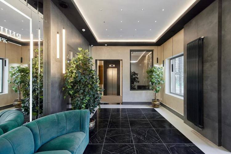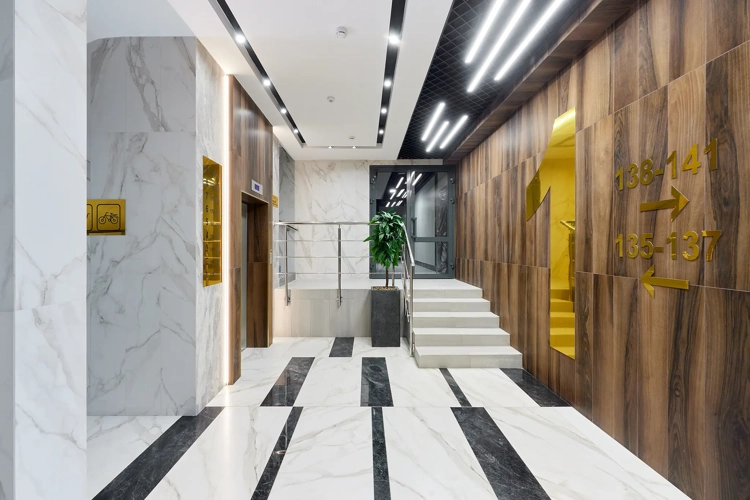 Кирпичные дома в неоклассическом стиле с дизайнерскими лобби, где отделка из камня и дерева напоминает интерьеры дорогих отелей.