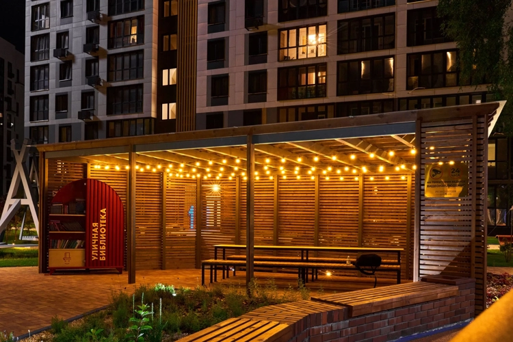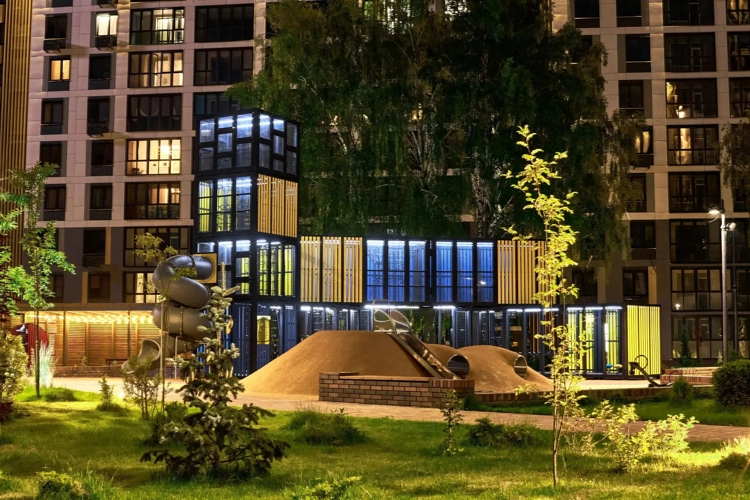 Огромная территория, где 76% площади — это зелень и более 200 видов растений. Это ваш личный парк без машин, с амфитеатром для встреч и уютными зонами для работы на свежем воздухе